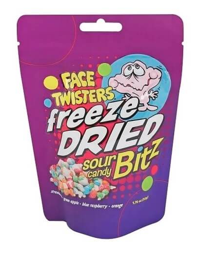 A Sweet Start With A Sour Twist! Freeze Dried Sour Candy Bitz Deliver A Unique Flavor Journey, Beginning With A Burst Of Sweetness That Quickly Turns Into A Zesty, Sour Finish. Each Tiny, Airy Bit Has Been Freeze-Dried For An Extra Crunchy Texture That Melts In Your Mouth, Intensifying The Flavors In Every Bite. These Eye-Catching Treats Are Sure To Stand Out On Any Candy Shelf, Offering A One-Of-A-Kind Experience For Sour Candy Fans! Specializing in sour fruit-flavored confections, Face Twisters offers Candy Bitz, a unique freeze-dried treat to take on the go, in a 1.75 oz bag. Coming in a resealable pouch for easy storage, the futuristic treats deliver a special, lightweight texture and a variety of face-puckering flavors.